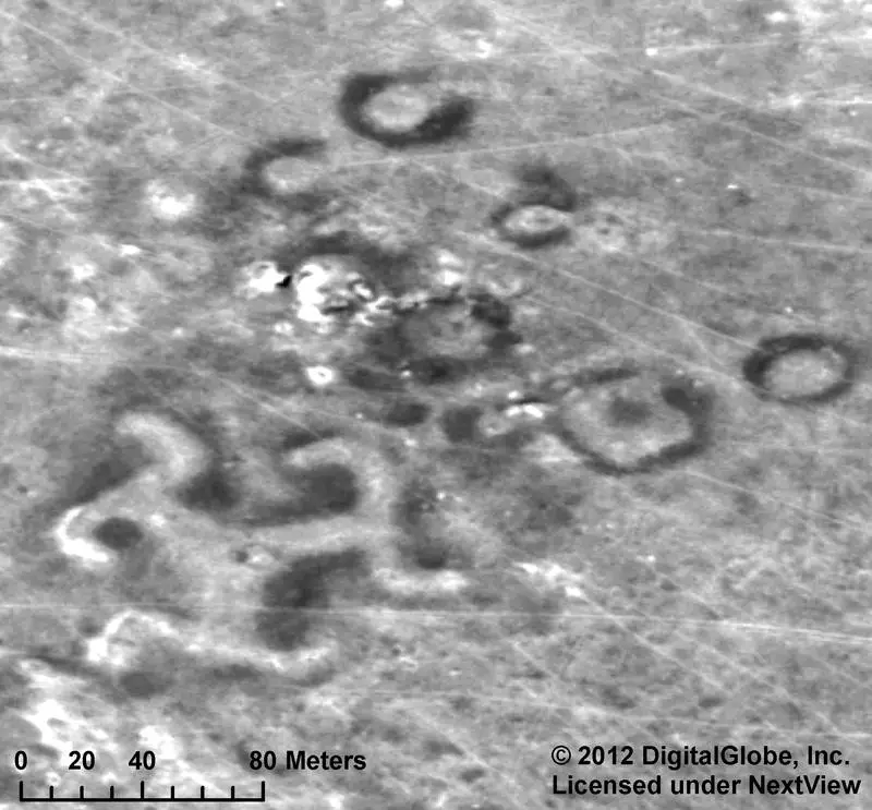 Using Google Earth, Dmitriy Dey discovered no less than 260 figures among mounds, ditches, and embankments arranged in five basic forms in the Turgai region of northern Kazakhstan.