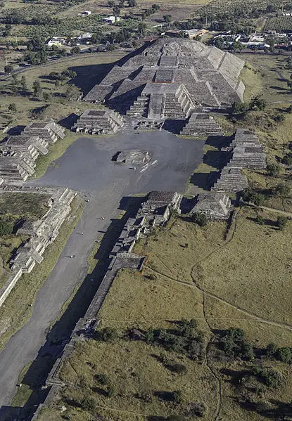 Aerial view of the Pyramid of the Moon at the end of the Avenue of the Dead. Image via Wikimedia.[/caption]