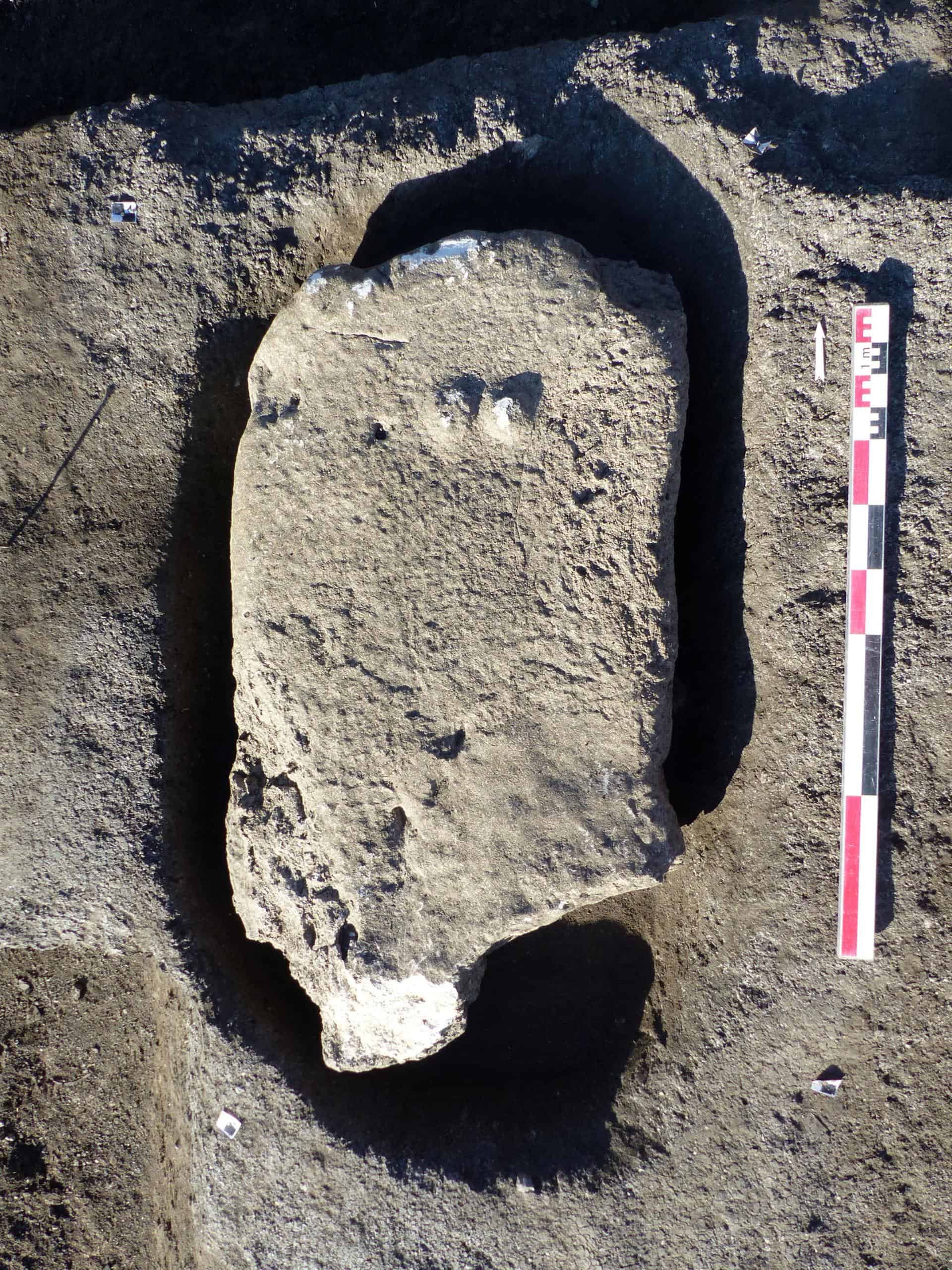 Another view of the anthropomorphic menhir stone. Image via INRAP.[/caption]