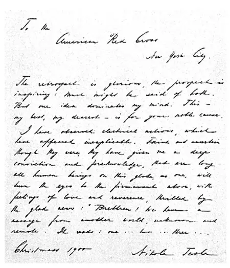 To the American Red Cross, New York City. The retrospect is glorious, the prospect is inspiring: Much might be said of both. But one idea dominates my mind. This — my best, my dearest — is for your noble cause. I have observed electrical actions, which have appeared inexplicable. Faint and uncertain though they were, they have given me a deep conviction and foreknowledge, that ere long all human beings on this globe, as one, will turn their eyes to the firmament above, with feelings of love and reverence, thrilled by the glad news: "Brethren! We have a message from another world, unknown and remote. It reads: one… two… three…" Christmas 1900 Nikola Tesla