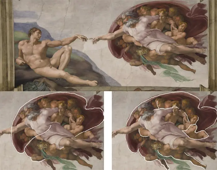 Physician Frank Meshberger has several suggestions about the intriguing artwork where he speculates that Michelangelo encircled God with a shroud wanting to represent (and he did so incredibly well) the human brain perhaps suggesting that that God was not only giving life to Adam, but also gifting him with a supreme human intelligence.
