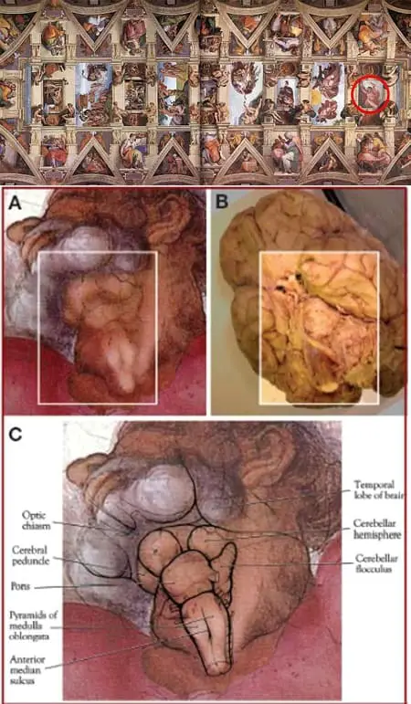Michelangelo completed his work on the ceiling of the Sistine Chapel in a period of four years, starting his painting from east to west and beginning from the entrance of the Chapel and finishing above the altar. The section where he depicted God separating light from darkness is where researchers, historians and art critics are struggling to understand what this genius was trying to say; hiding an accurate depiction of the human brain.