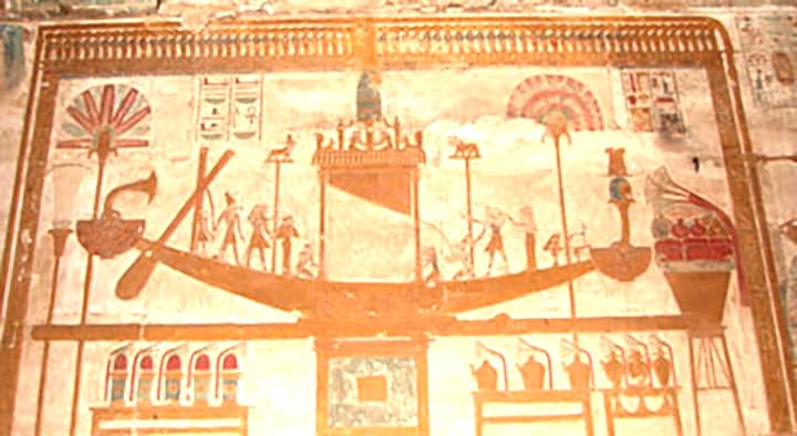 "On the opposite wall of the Osiris Chapel at Abydos is the Osiris Device, enhanced, I noticed, with the ship of eternity upon which the king will sail into eternity as a star. This ship resembles a modern drawing of a wormhole. Pay particular attention to Sety who appears to have transformed his body into the Osiris Device… or is coming out of it. This is a wonderful moment of transformation and resurrection," wrote Henry.[caption id="attachment_42485" align="aligncenter" width="720"]